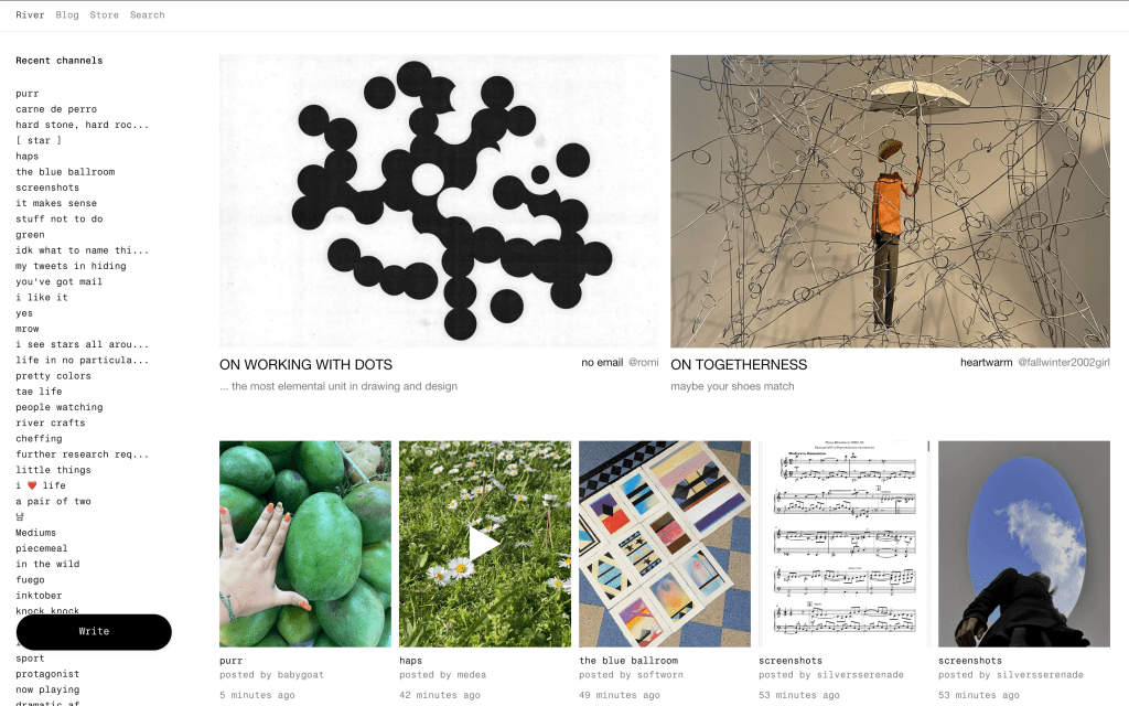 River, to me, is a mix of all of the big social media platforms of the past decade. Its interface is streamlined and minimal, and the app gives users the ability to upload anything their hearts desire. Text like Twitter, pictures like Instagram, mp3s like SoundCloud, or, through a recent update, longform blogs like Substack or LiveJournal. Posts are all public and organized by user-created channels which they can curate themselves and accept submissions to, to form “connections.” While River’s calling card is “a diary for everything,” which sounds individual, connection is really the basis of the platform.