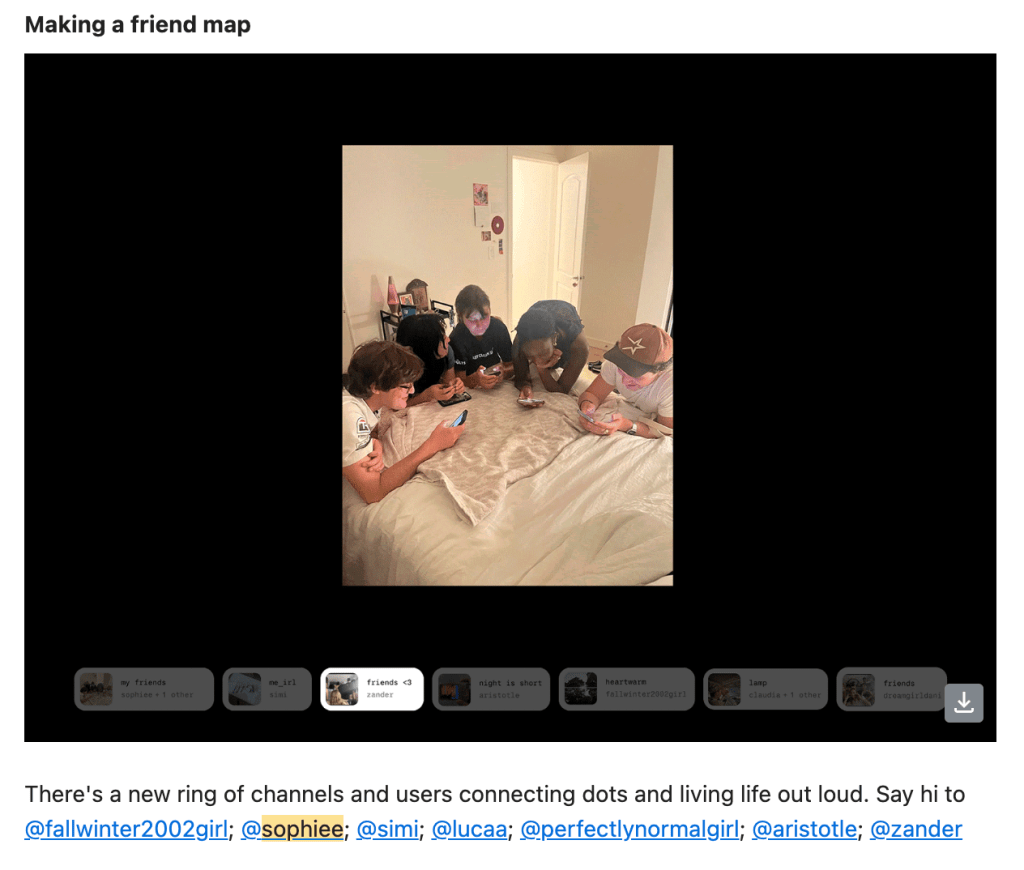 The six of us, me (simi), Sophie (formerly sophiee, now 800cherries), Luca (lucaa), Dani (perfectlynormalgirl), Claudia (claudia), and Zander (zander), each downloaded River and scrolled around, commentating and asking questions about the app. Is it like Instagram? Who are these people? What’s a channel? Who just connected my picture? @networkp submitted to my channel?!